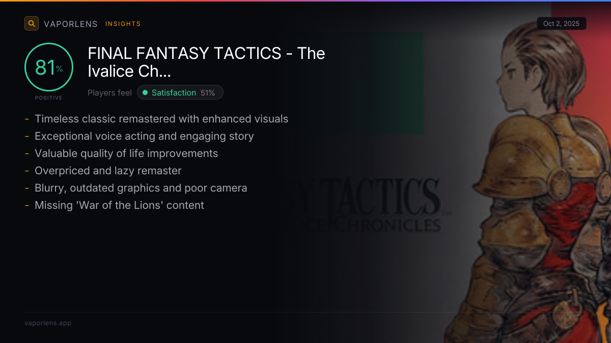Excitement is driven by the long-awaited PC release of a beloved classic, allowing players to revisit a masterpiece with modern enhancements. The high quality of the remaster, including new visuals and voice acting, generates enthusiasm for replaying the game and experiencing its deep story and tactical gameplay. Many express anticipation for future content, mods, or even sequels within the Tactics series.