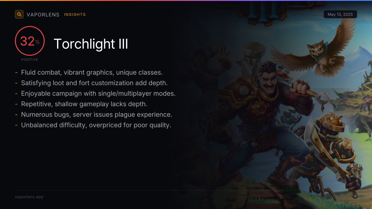 | The game features fluid, fast-paced, and engaging combat with responsive controls, diverse skills, and satisfying impact. Many reviewers found the combat enjoyable, especially on higher difficulties, and noted its improvement over previous titles. The game also offers a great co-op experience. | 28% |