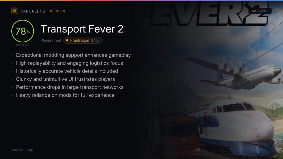 Excitement is driven by the game's modding potential, historical progression in campaign mode, and the anticipation for future installments (e.g., Transport Fever 3). Players are also excited by the variety of transport options, the challenge of building complex supply chains, and the immersive experience of seeing their networks come to life.