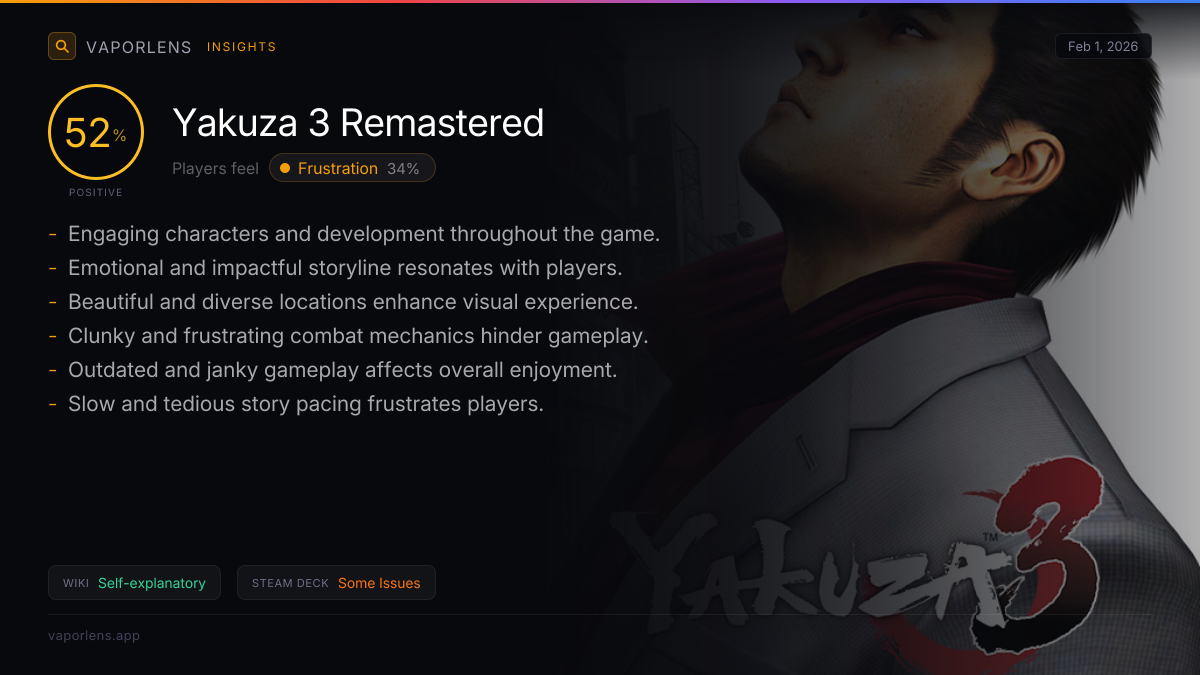 The analysis of user feedback reveals several significant issues with the game on the Steam Deck. The most critical problems include frequent game crashes and the lack of an auto-save feature, which severely disrupts gameplay. Additionally, many users have criticized the game's controls and gameplay mechanics, describing them as outdated and non-fluid. Battery drain is also noted as a concern, though it is less severe compared to the other issues. On a positive note, some users have reported that the game runs well on the Steam Deck, indicating good performance and stability. Score: 75 / 100