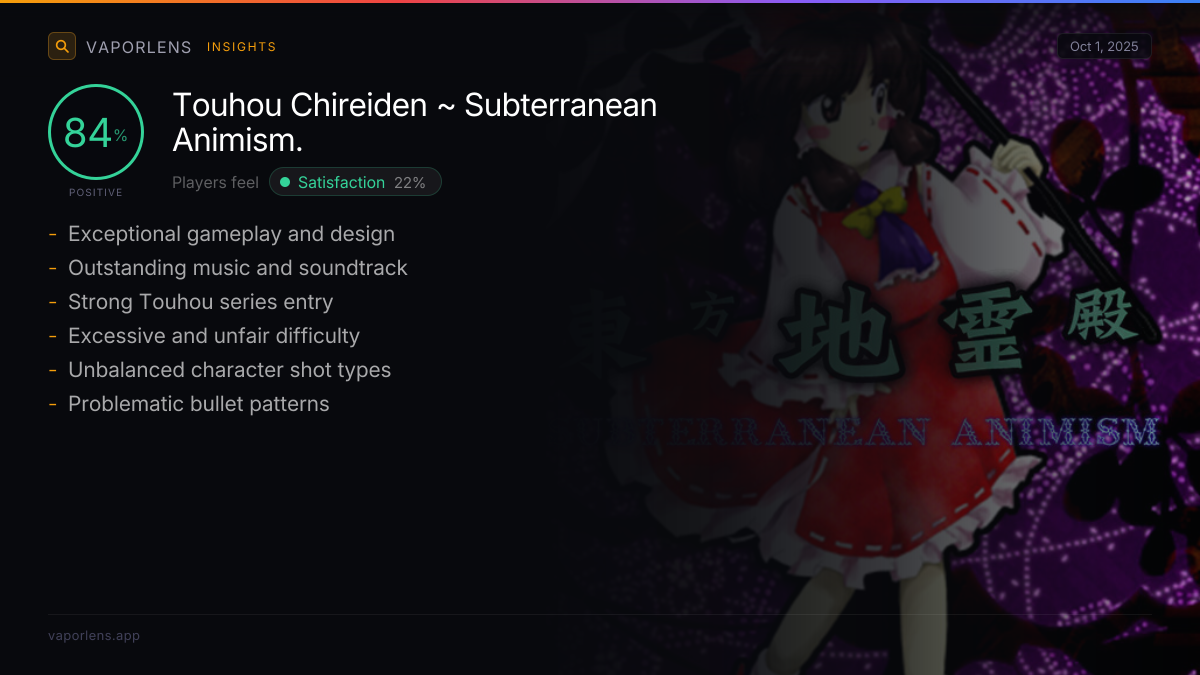 Players feel satisfied by the game's overall high quality, including its refined mechanics, engaging music, and character design. A significant source of satisfaction comes from overcoming the game's fair but extreme challenges, mastering difficult bullet patterns, and achieving progress or completion, which provides a strong sense of accomplishment.