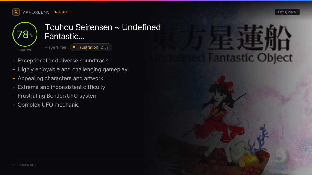 Players appreciate the game's replayability, gameplay variety, and high polish. The music, character writing, and the depth of ZUN's work, especially within the broader Touhou Project, are highly valued, along with the unique UFO system and atmospheric visuals.