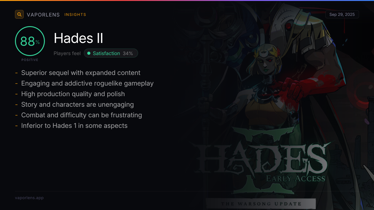| Players consistently praise the game's core gameplay loop as fun, fluid, and highly addictive, leading to extended play sessions and a strong 'just one more run' appeal. The combat is described as tight, fast, and rewarding, with enough variety to prevent tedium even after many hours. | 64% |