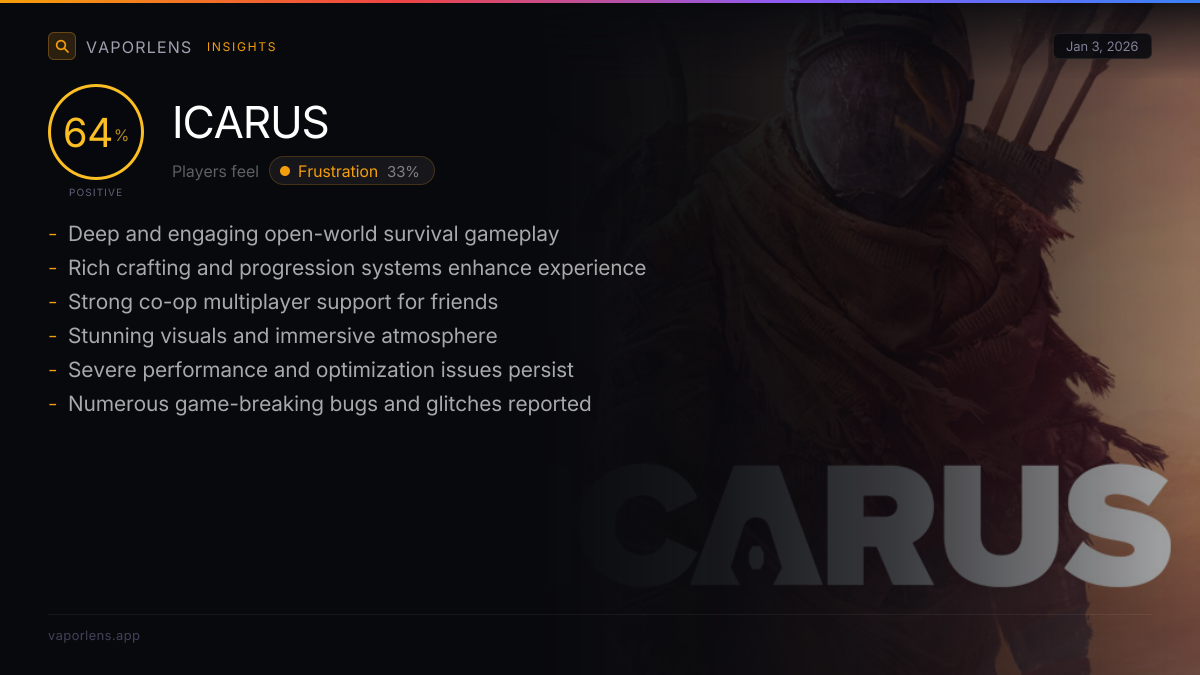 Players experience frustration primarily due to widespread performance issues, including FPS drops, crashes, and poor optimization, even on high-end hardware. Additionally, repetitive or tedious gameplay mechanicsāsuch as excessive grinding, resource management, and base rebuildingāalong with pervasive bugs, broken mechanics (e.g., water systems, AI), and unfair progression systems (e.g., pay-to-win, DLC-locked content) exacerbate the negative experience.