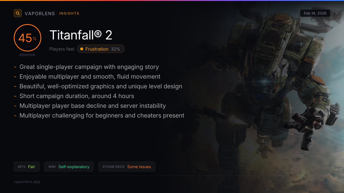 The analysis of user feedback for the Steam Deck experience reveals significant issues with the EA App, multiplayer and anti-cheat problems, and various technical bugs. Despite these challenges, many users appreciate the gameplay experience. The game's compatibility with Steam Deck is mixed, with some users facing considerable friction. The EA App and multiplayer issues are the most impactful themes, causing high severity problems for users. Score: 55 / 100