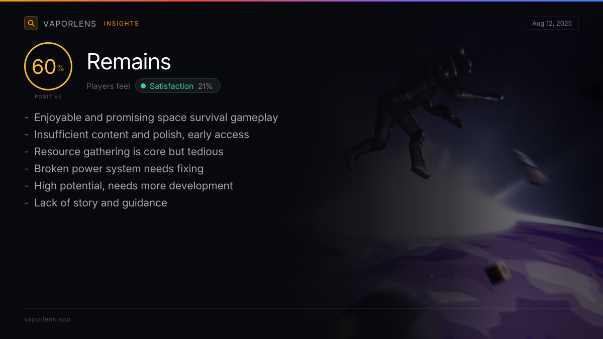Excitement is driven by the game's potential, its addictive gameplay loop for gather-crafters, and anticipation for future updates and features. Players who enjoy survival, crafting, and space genres find the game's concept and initial quality particularly engaging.