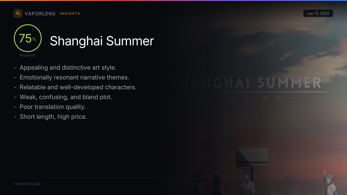 | The game features a distinctive and appealing art style, often described as anime-inspired with soft visuals, detailed backgrounds evoking Shanghai, and well-executed character designs and CG artwork. Reviewers highlight the warm color palettes, hand-drawn aesthetics, and overall visual presentation as contributing significantly to the game's immersive atmosphere and emotional impact. | 59% |