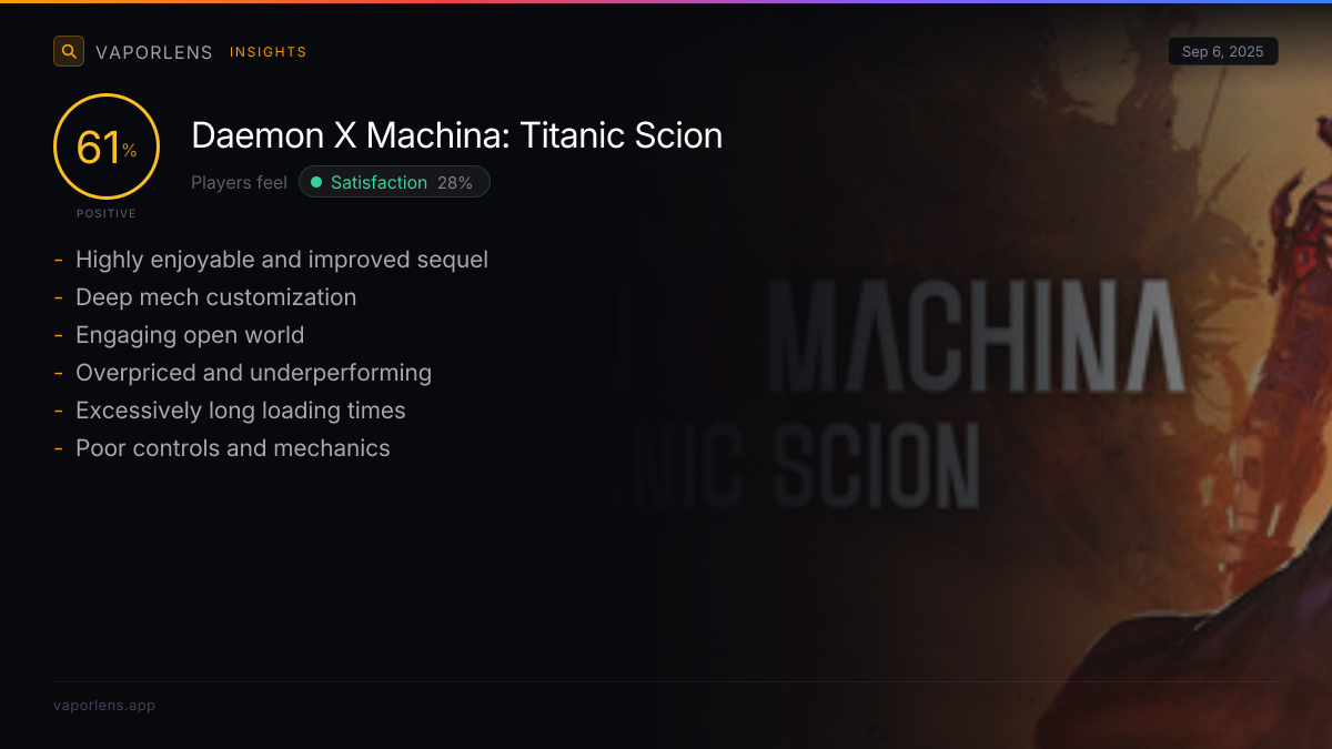 | The game successfully caters to fans of mech-themed games, often being compared favorably to titles like Anthem and Armored Core. Reviewers appreciate its blend of open-world, hack-and-slash, and mech customization elements, fulfilling a niche many have been seeking. | 39% |