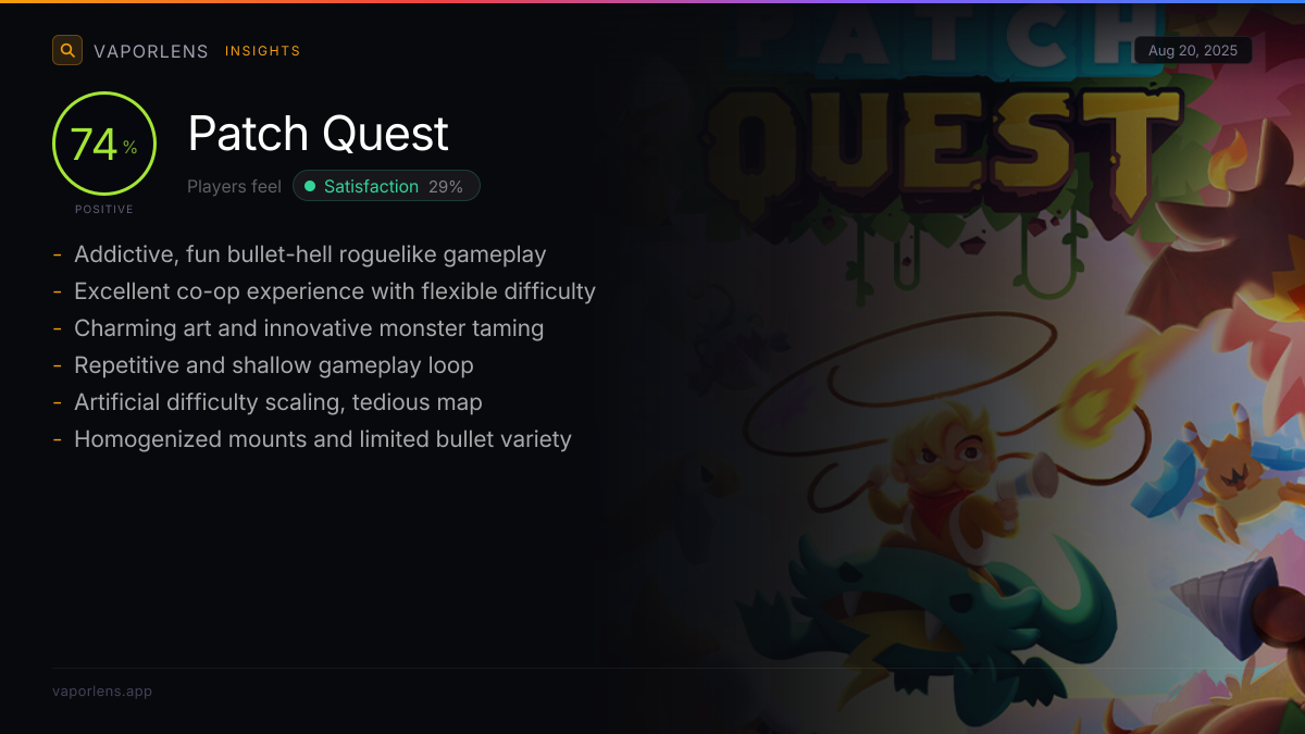 Players felt satisfied by the game's high quality, polished presentation, and appealing art style. The engaging gameplay loop, including monster collecting, varied mechanics, and well-balanced difficulty options, contributed significantly to their enjoyment. Many also appreciated the game's value for money and its suitability for casual play or co-op experiences.