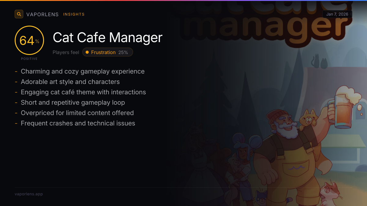 Disappointment arises from unmet expectations regarding depth and content, with players highlighting shallow gameplay mechanics, limited post-story replayability, and repetitive routines. Many feel the game’s full price is unjustified due to its short length, lack of customization (e.g., decor flexibility, cat interactions), and failure to deliver on its core premise (e.g., cats feeling irrelevant). Technical issues like crashes and poor localization further diminish its value.