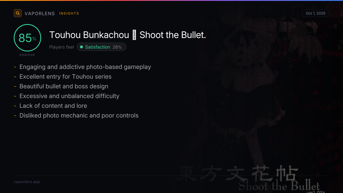 Enjoyment stemmed from the game's unique photojournalism aspect and its departure from typical Touhou titles. Players found the core gameplay loop, creative mechanics, challenging puzzle-patterns, and excellent controls to be very fun and addicting, especially after the initial learning curve.