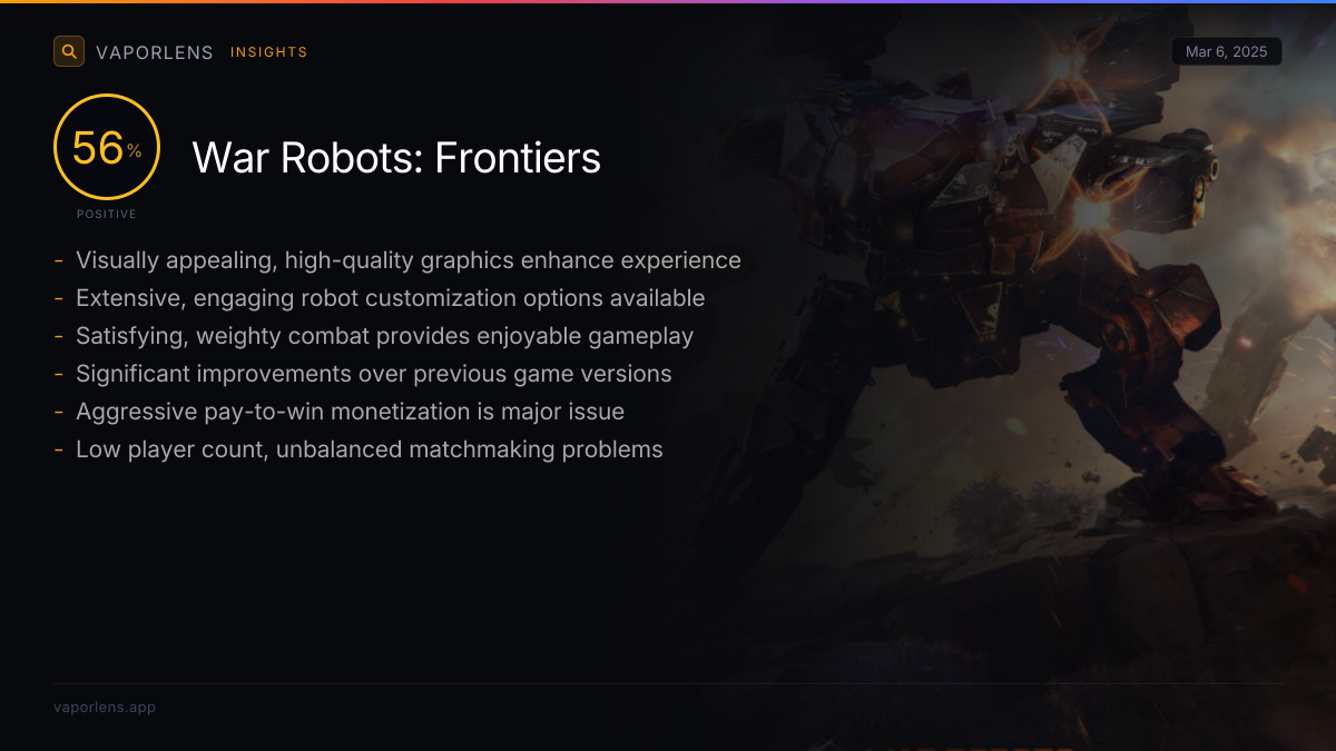 The game is recommended for players who enjoy realistic shooters, mech shooters, or the original War Robots. It's seen as a good choice for fans of huge robots with guns and multiplayer shooting games in a futuristic setting.