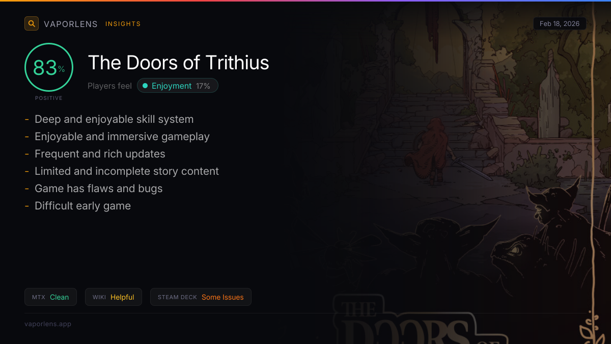 The analysis of user feedback for the Steam Deck experience reveals several key issues. Controller support is a significant concern, with users expressing fatigue from using the trackpad extensively and a general desire for better controller integration. Audio issues, including delays and lag, have been reported, which severely affect immersion and gameplay experience. Additionally, there are general calls for developers to address various Steam Deck issues, indicating a need for overall improvement. Performance issues such as overheating and screen freezing have also been noted, which can significantly impact the user experience. Score: 55 / 100
