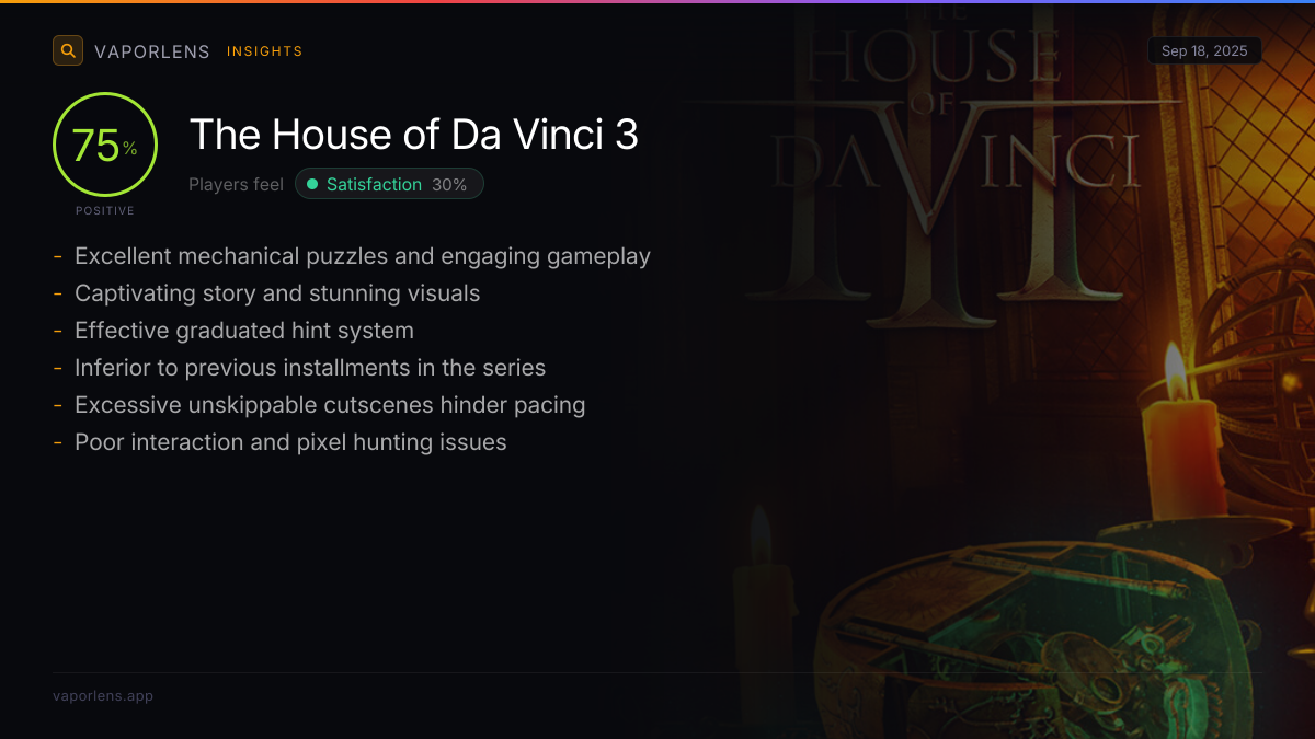 | Players consistently praise the game's puzzles for being clever, intuitive, challenging yet satisfying, and perfectly balanced. The puzzles are well-integrated into the story, offering a rewarding and mentally stimulating experience that avoids frustration. | 100% |