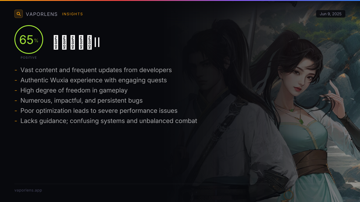 The game shows potential but feels outdated and unpolished. Reviewers point to outdated graphics, long unskippable cutscenes, and a framework that needs refinement. Despite these issues, the game's open-world freedom and martial arts system are promising, and the developers are actively updating the game.