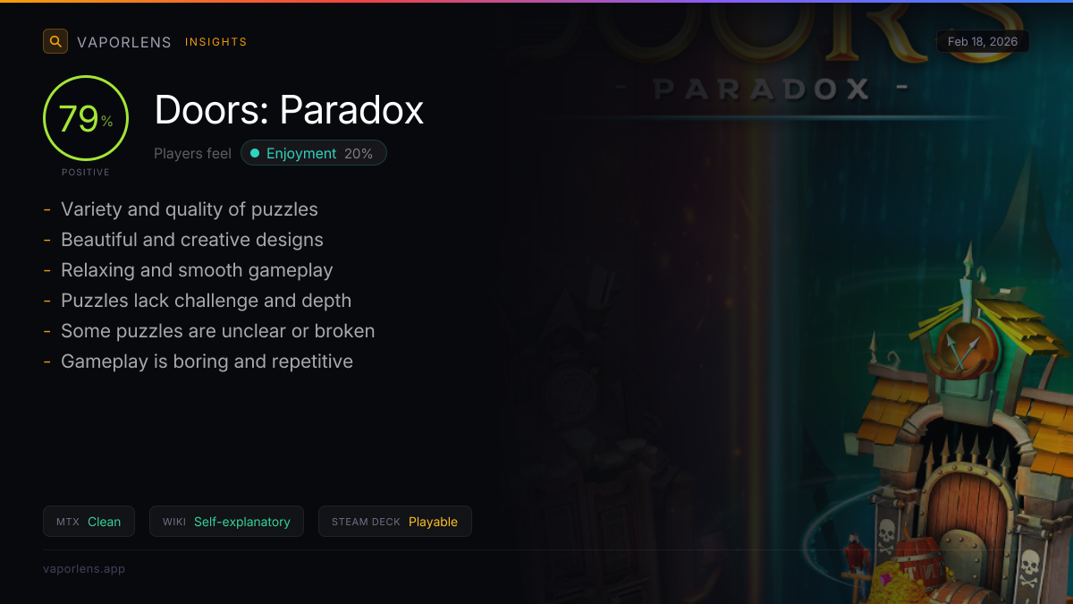 The analysis of user feedback reveals significant issues with cloud saves not working, which severely impacts the user experience. However, the game shows good compatibility with Linux using Proton, which is a positive aspect. The overall experience is marred by the lack of functional cloud saves, leading to a higher friction score. Score: 50 / 100