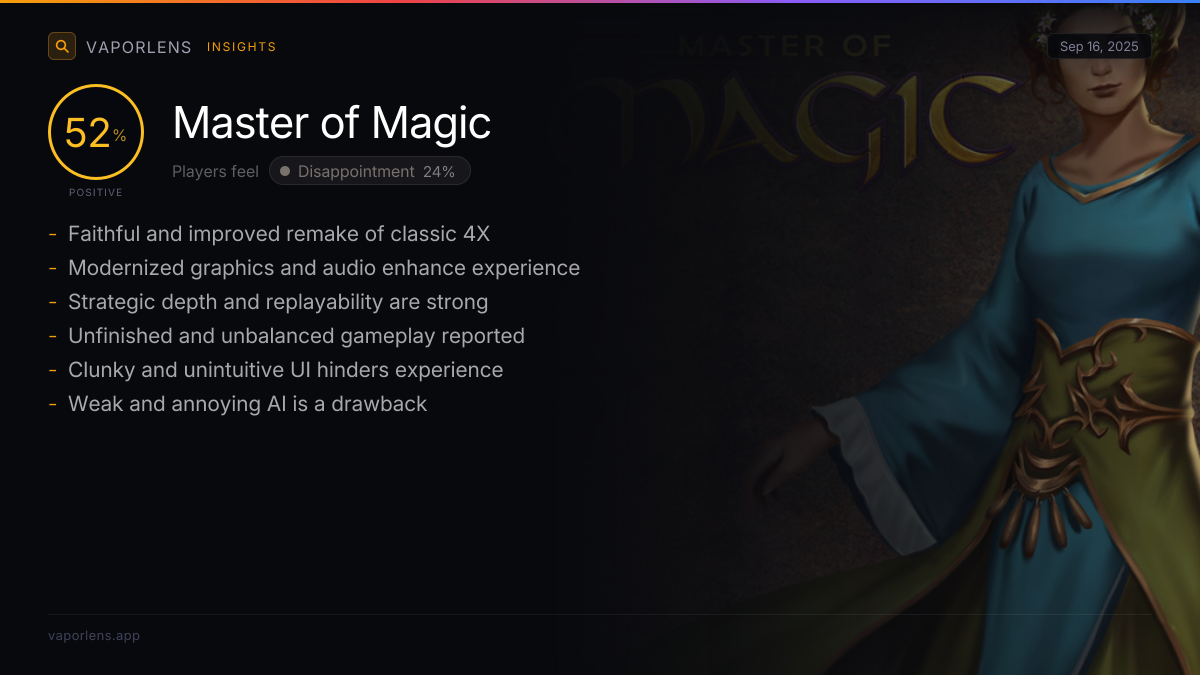 | Players highly praise the game as a faithful and improved remake of the original Master of Magic. It successfully captures the essence and magic of the classic while introducing modern graphics, quality-of-life features, and bug fixes, making it appealing to both veterans and new players. | 99% |