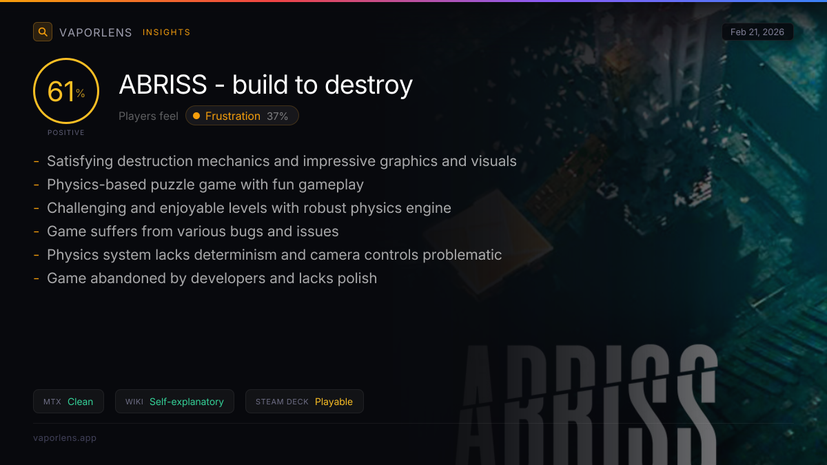 The analysis of user feedback reveals significant performance and stability issues with the game on Steam Deck. Users have reported high GPU usage, frequent frame drops, and crashes, which severely impact the gameplay experience. However, there are also positive reports indicating that the game can work beautifully under certain conditions. Score: 50 / 100