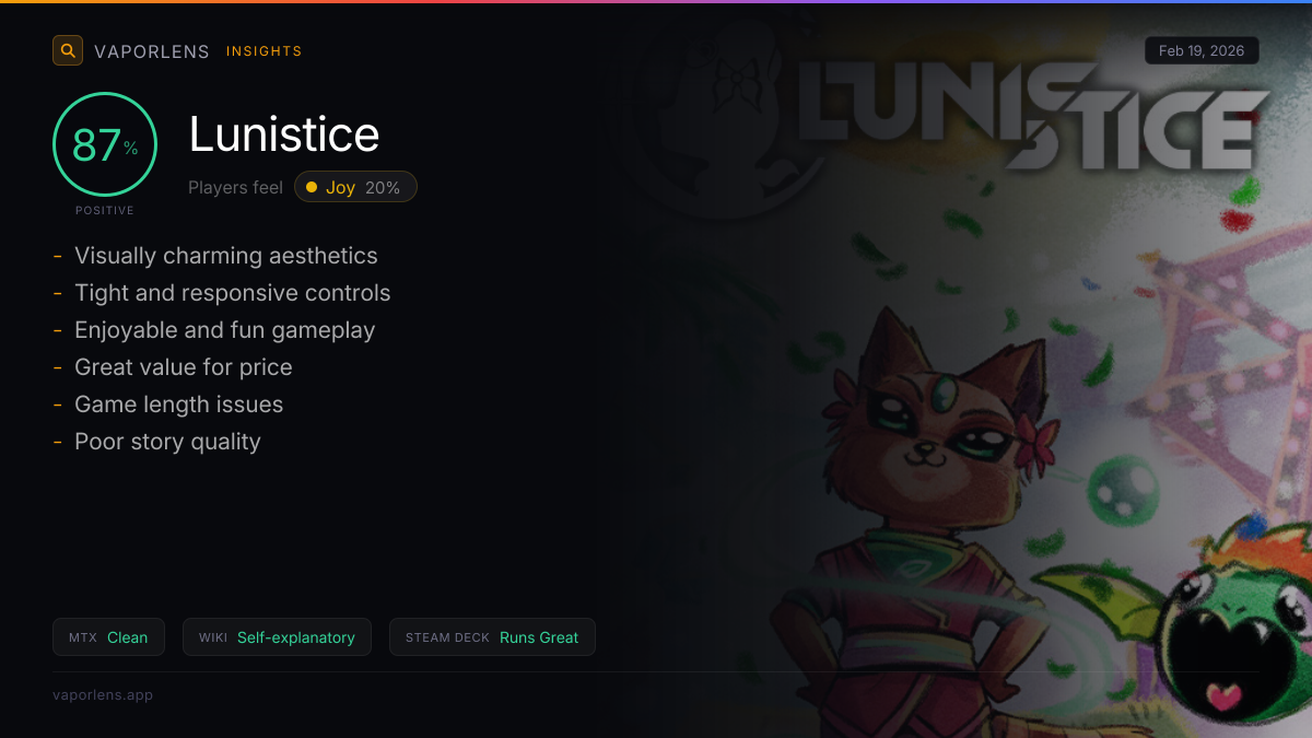 The game performs exceptionally well on the Steam Deck, with users reporting a seamless experience and high satisfaction. The primary issue noted was the default control sensitivity, which some users found too high but were able to adjust to their liking. Score: 10 / 100