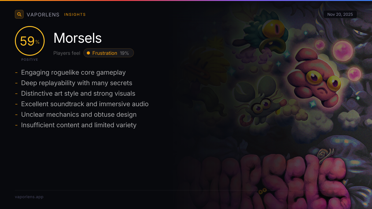 Many players feel the game lacks sufficient content, specifically noting the limited number of Morsels, transformations, and uninteresting/repetitive levels. The game feels shallow and unfinished, with players quickly exhausting available options, diminishing replayability and long-term engagement.