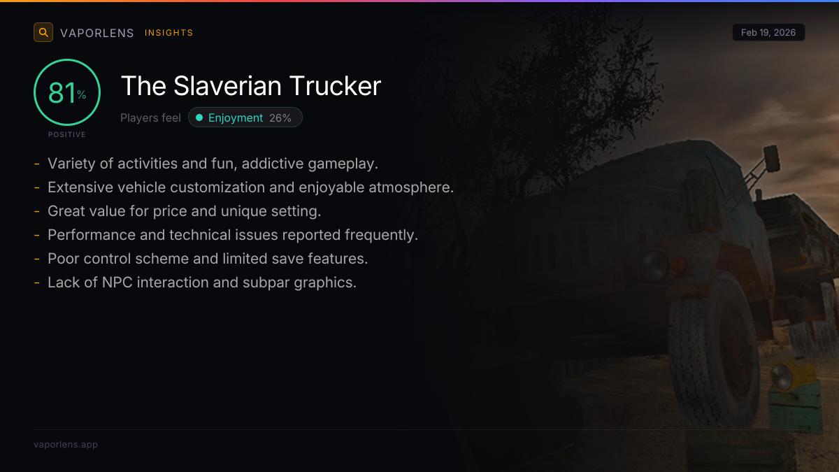 Players appreciate the immersive and atmospheric game world, which offers a variety of engaging activities such as driving mechanics, exploration, and business management. The freedom in customization and the blend of different game styles contribute to a rewarding and addictive gameplay experience.