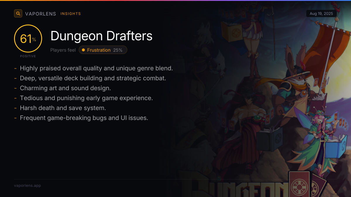 Disappointment arises from the game's perceived lack of meta-progression and the feeling that time is wasted due to punishing death mechanics and lost runs. Players are also let down by the absence of certain quality-of-life features, unclear card synergies, and a general sense that the game fails to merge its ideas into a cohesive and satisfying experience. Some feel the early game is boring or that the game doesn't live up to initial expectations.
