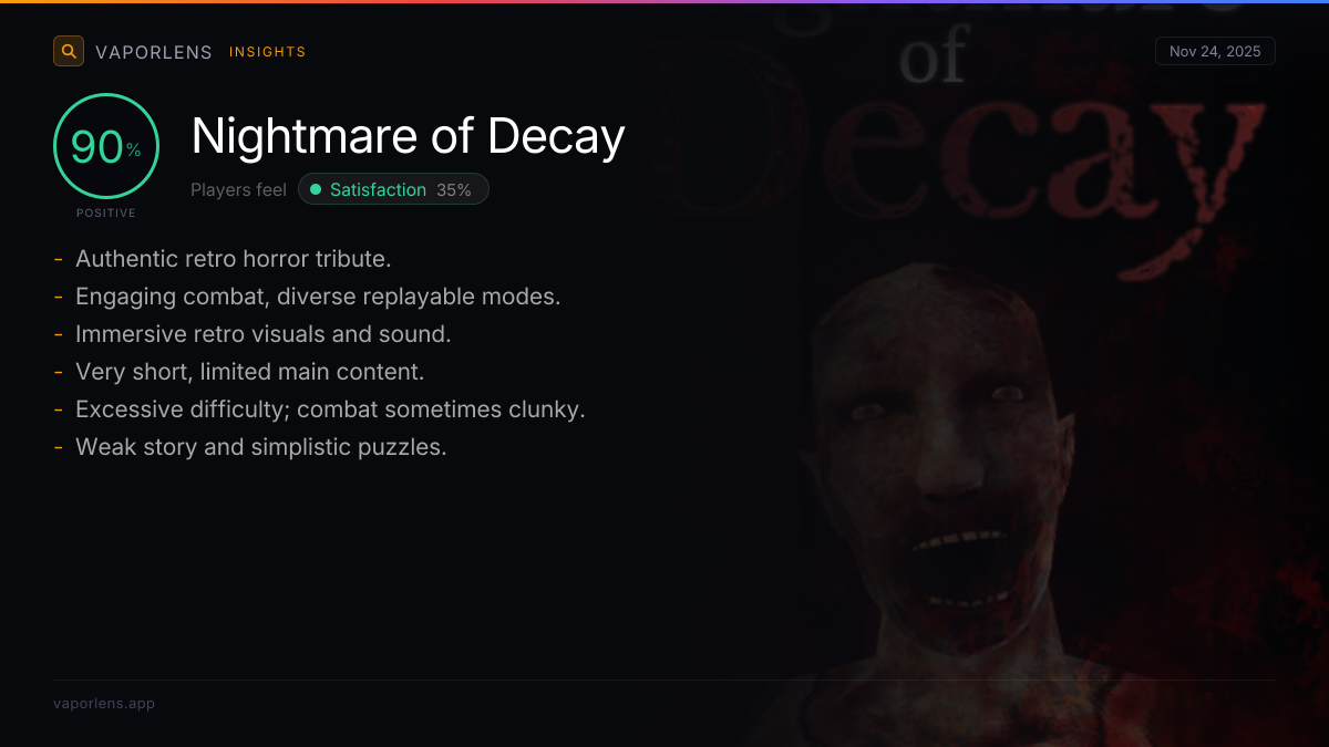 Players felt satisfied by the game's strong value proposition, high quality gameplay, and excellent atmosphere. The effective gunplay, rewarding puzzles, and successful homage to classic survival horror, particularly Resident Evil, contributed significantly to this positive experience. Additionally, replayable extra modes and overall polish enhanced the sense of a well-made, enjoyable indie title.