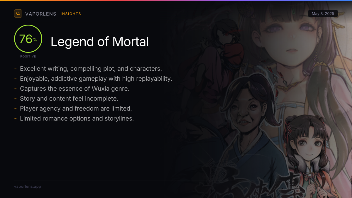 - The game successfully captures the essence of the Wuxia genre, fulfilling the dream of becoming a martial arts hero. Reviewers are emotionally moved by the characters' journeys and the themes of chivalry and perseverance. The game is recommended for fans of martial arts stories and those seeking an immersive and emotionally resonant experience.