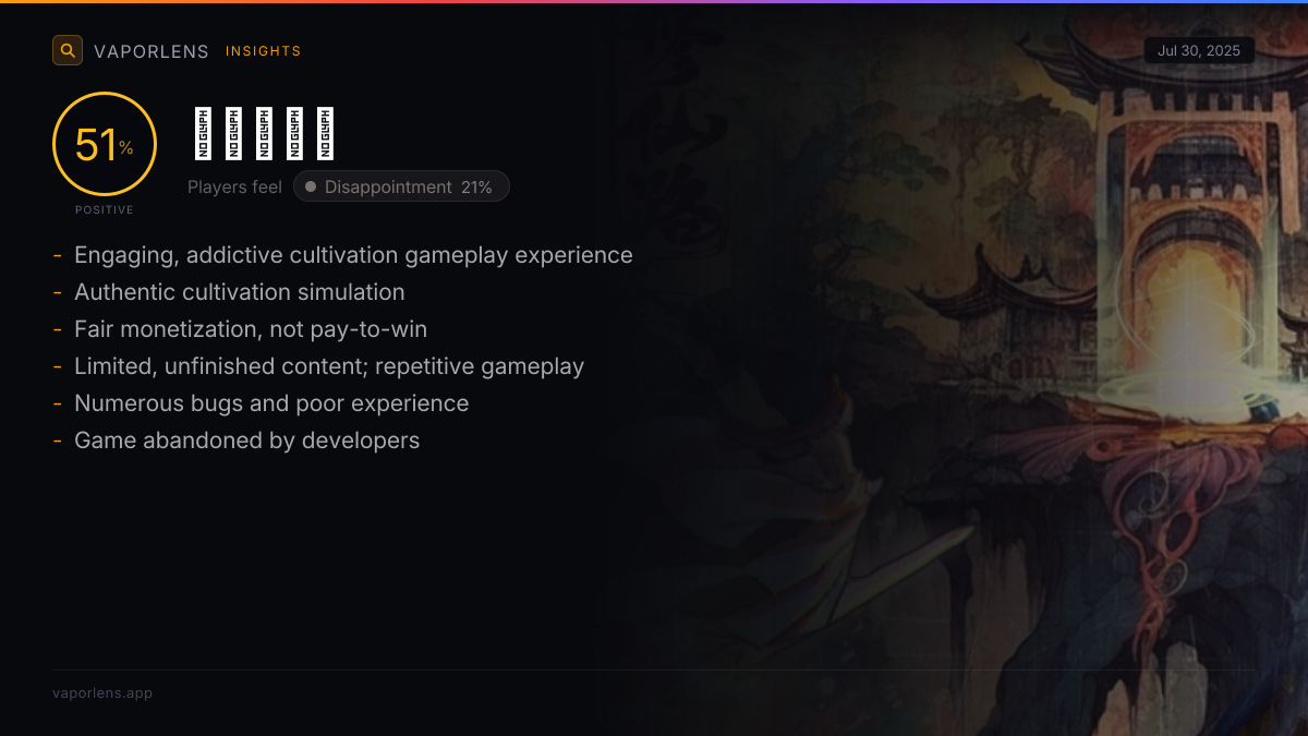 Satisfaction is driven by the game's immersive quality, high replayability, and effective gameplay loop, particularly for those who enjoy the cultivation theme. Players appreciate the game's unique open-world experience, its ability to fulfill expectations for the genre, and the overall fun derived from its core mechanics and progression.