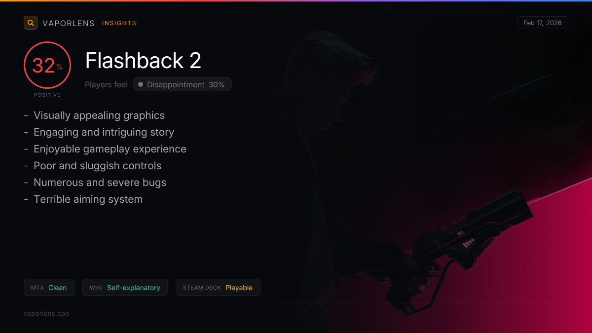 The analysis of user feedback for the Steam Deck experience reveals significant performance issues, including frame rate drops and poor stability. Additionally, users have reported problems with control mechanics and technical stability, such as the game not launching after reinstallation and jerky movements. These issues collectively impact the overall user experience negatively. Score: 50 / 100