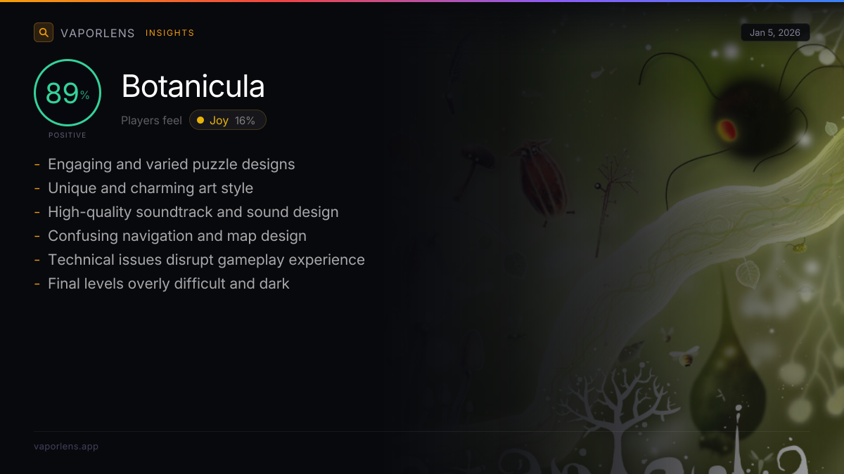 Players experience joy primarily due to the game's whimsical world, charming character interactions, and delightful visual and auditory design. The heartwarming story, fun puzzles, and opportunities to share the experience with others (e.g., playing with a child) amplify this emotion.