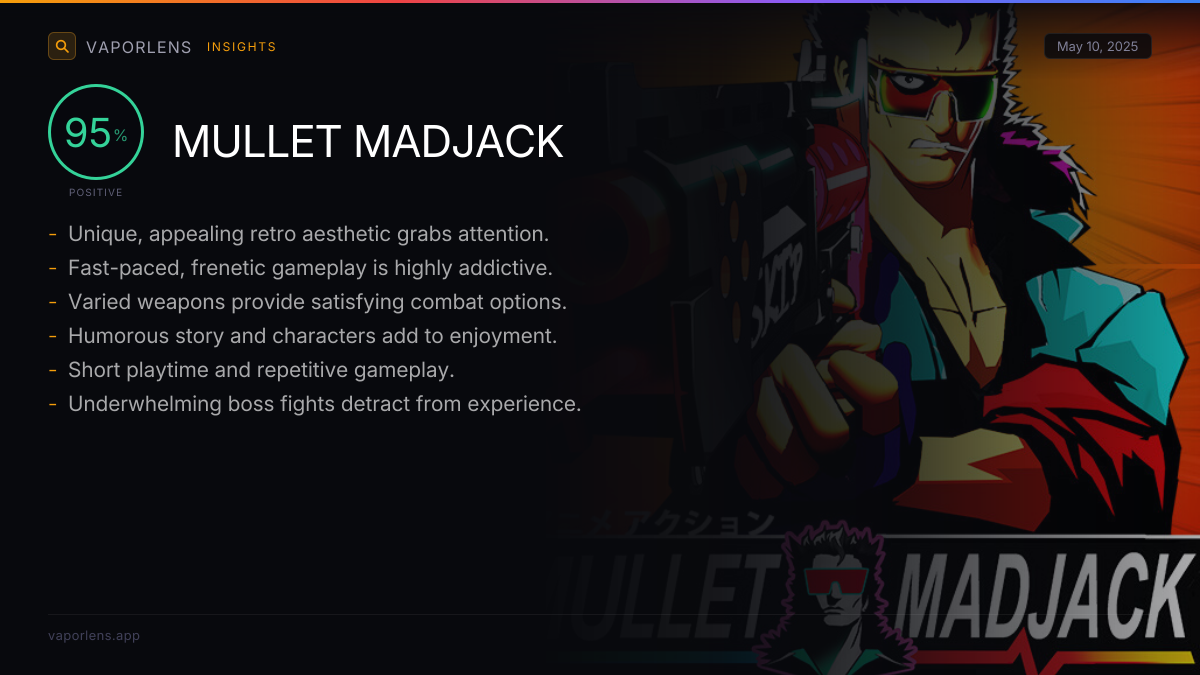| The game's standout feature is its unique and appealing retro aesthetic, drawing heavily from 80s and 90s anime, cyberpunk, and synthwave influences. This extends to the visuals, music, and sound design, creating a cohesive and immersive experience that evokes nostalgia while feeling fresh and stylish. Many reviewers specifically praise the art style and soundtrack as highlights. | 97% |