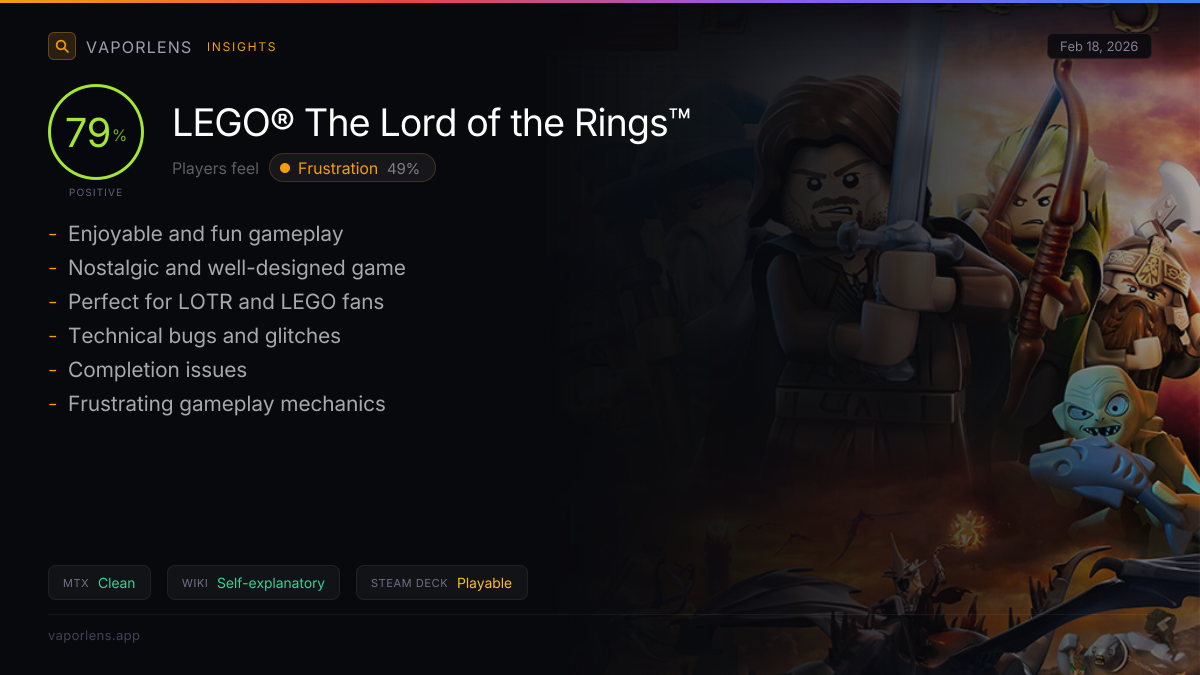 The analysis of user feedback for the Steam Deck experience reveals several key themes. Many users report the need to use Proton or custom Proton versions to resolve graphical issues and improve stability, indicating a significant technical barrier. Stability issues, including crashes and unplayable conditions due to graphical problems, are also frequently mentioned. Despite these issues, many users have a positive experience playing the game on Steam Deck. Control issues, particularly with camera and puzzle controls, are noted as a common problem. The overall experience suggests that while the game is playable and enjoyable on Steam Deck, it requires some technical adjustments and has notable stability and control issues. Score: 50 / 100