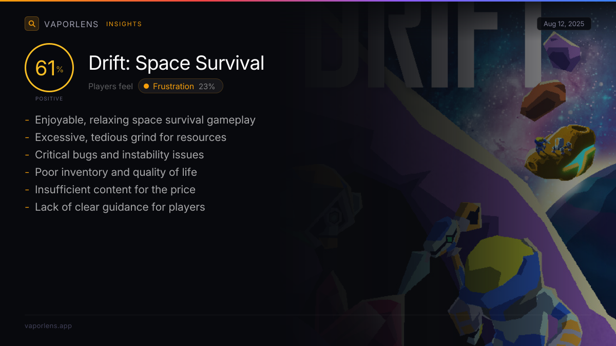 Satisfaction stems from the game's intuitive controls, enjoyable multiplayer, and a generally chill and relaxing crafting and survival experience in space. Players appreciate the balance between grind and progression, the game's originality, atmosphere, and fitting music and visuals. The overall quality, polished feel, and solid progression contribute to a positive player experience.