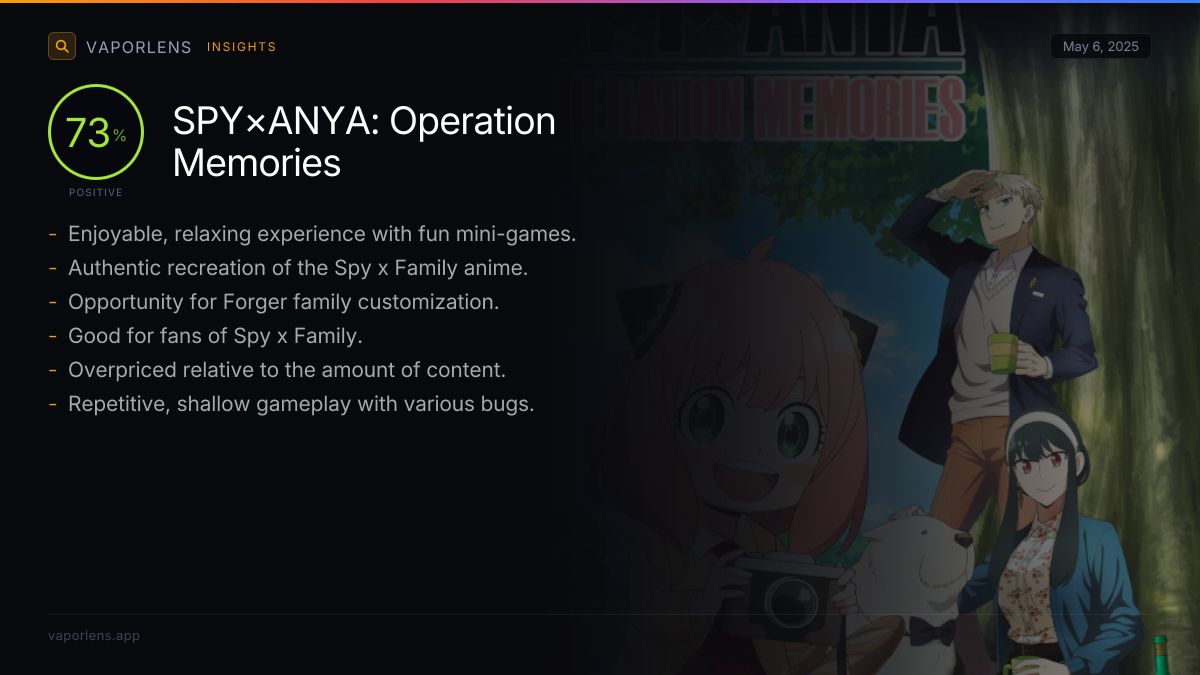 | The game authentically recreates the Spy x Family anime experience. It features faithful character models, animations, iconic locations, and the original Japanese voice actors, capturing the art style and humor of the series. | 86% |