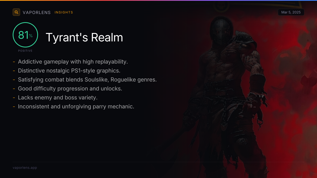 Reviewers see potential in the game, particularly for fans of Souls-like games, and suggest future content could expand on this. Specific suggestions include adding stealth mechanics and a poise/stance system to deepen the combat and make armor more impactful.