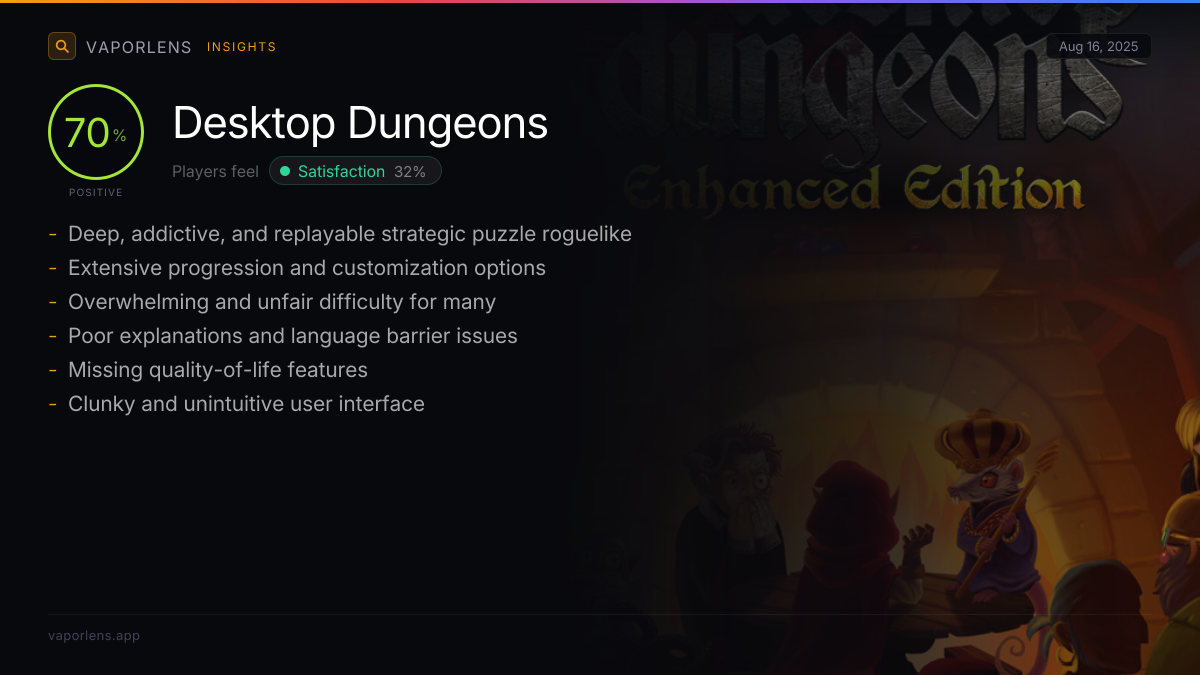 Players feel satisfied due to the game's unique blend of roguelike and puzzle elements, offering deep strategic gameplay, high replayability, and rewarding progression. The game's challenging yet fair difficulty, combined with its suitability for short play sessions, contributes to a sense of accomplishment and long-term enjoyment. Its overall quality, content, and value for money also consistently meet or exceed player expectations.