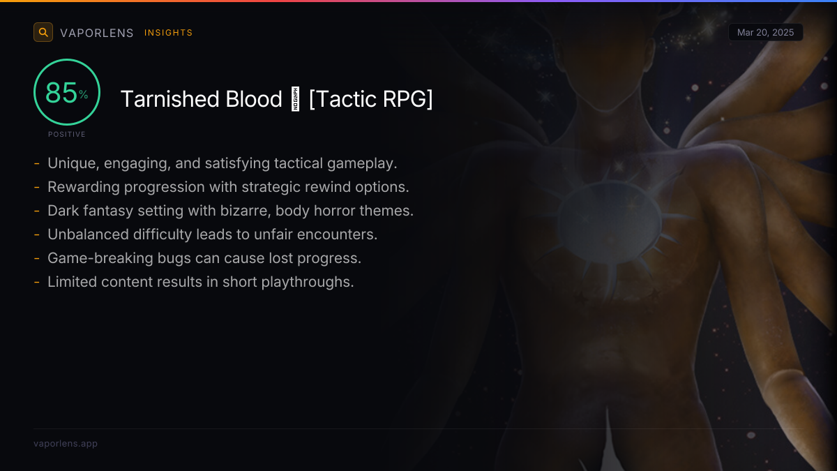 Many reviewers recommend the game, especially to players who enjoy challenging, tactical RPGs with time-based mechanics and dark fantasy settings. Several reviewers draw comparisons to games like Darkest Dungeon and Kingdom Death: Monster, suggesting a niche appeal for fans of those titles.