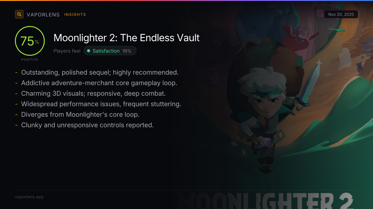Players feel the game has lost the 'Moonlighter' identity, with significant changes from the first game that negatively impact the experience. Specific concerns include a less satisfying exploration system, a rushed story, a less unique shop system, and an overall feeling that the game has become less leisurely and simple.