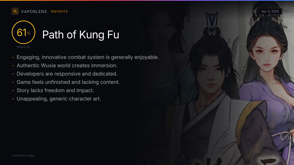 Many reviewers recommend the game to fans of the Wuxia genre, citing its martial arts themes, engaging story, and immersive world. Some reviewers highlight the game's potential to capture the essence of Wuxia and fulfill the dream of experiencing the Jianghu world. Some reviewers urge the developers to focus on chivalry and justice in Wuxia games.