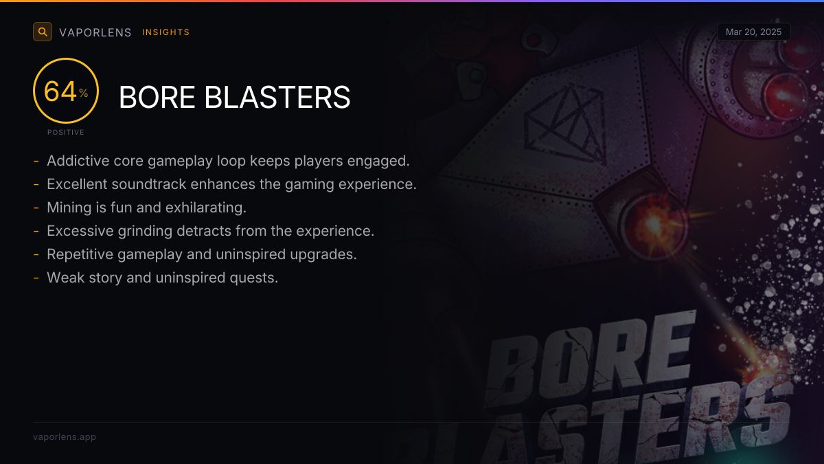 The core gameplay loop of mining, upgrading, and blasting enemies is initially fun and addictive. Players enjoy the sense of progression as they upgrade their ship and unlock new abilities. The game provides a satisfying experience with simple mechanics, making it easy to pick up and play.