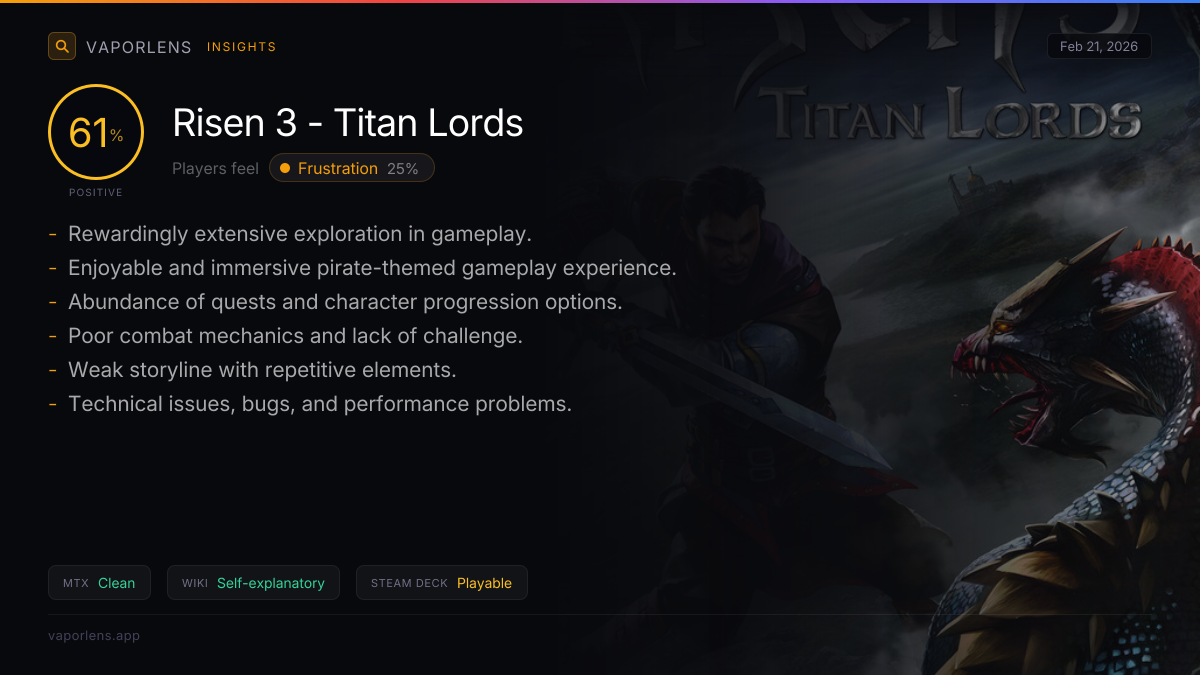 The analysis of user feedback reveals significant issues with the Steam Deck experience, particularly in the areas of control and stability. Users have reported sluggish, imprecise, and cumbersome controls, especially in the combat system. Additionally, there have been reports of the game crashing to desktop, indicating stability problems. These issues suggest that the game requires considerable tinkering and may not provide a seamless experience out of the box. Score: 50 / 100