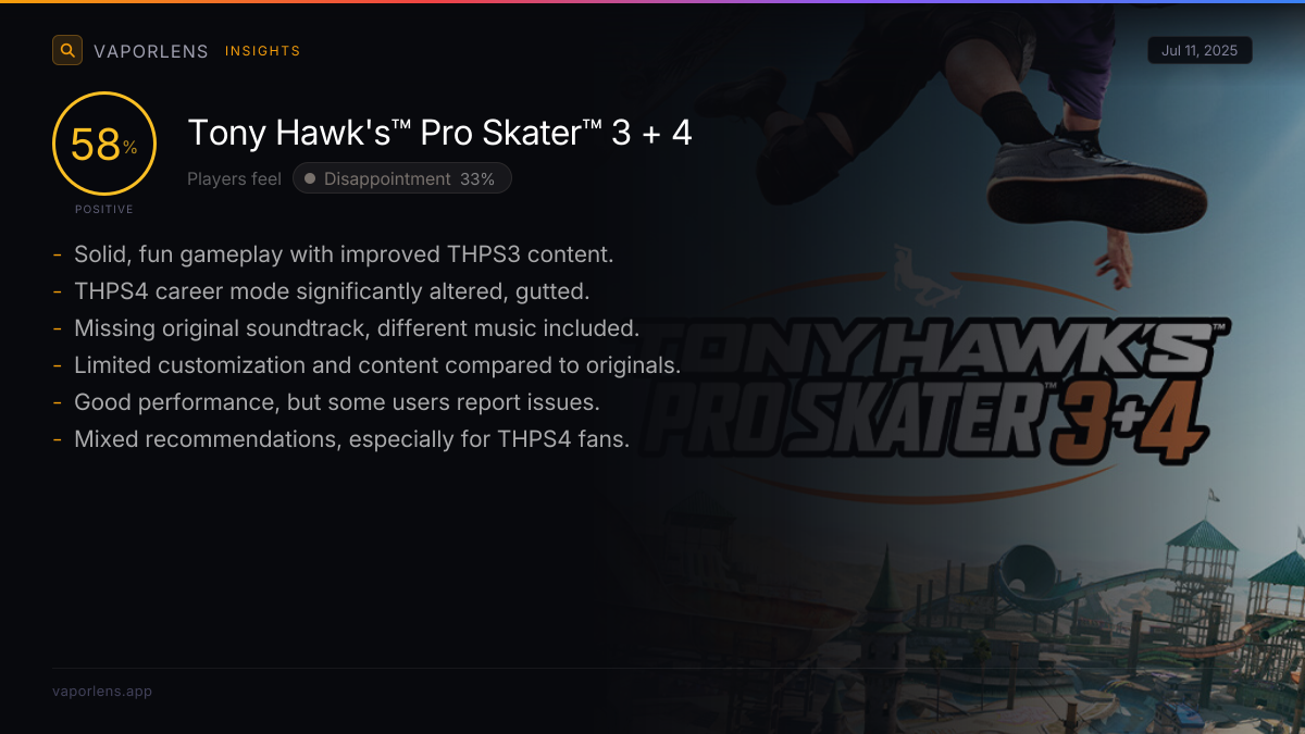 Players expressed significant disappointment primarily due to the perceived failure to faithfully remake THPS4, citing numerous missing content such as levels, career mode elements, and original soundtrack songs. The game's changes to core THPS4 mechanics and content, along with a feeling of it being a 'half-baked' or 'stripped-down' experience, led to a strong sense of being let down, especially when compared to previous remakes.