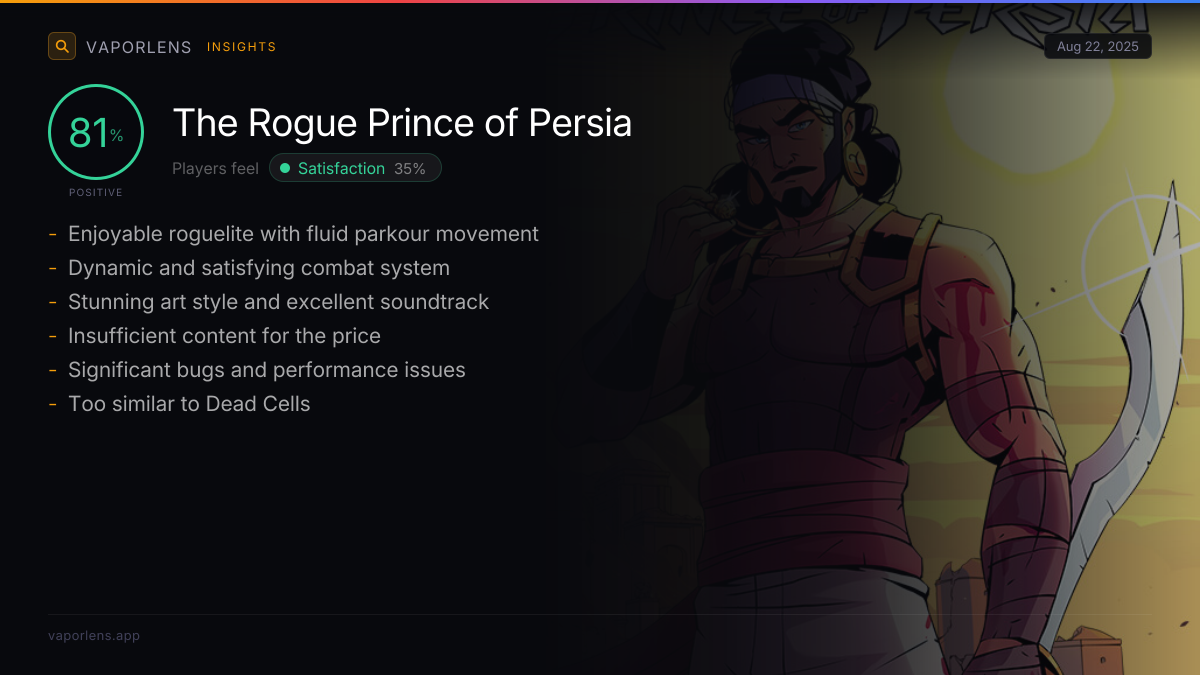| The game is highly lauded as an excellent roguelite, often compared favorably to genre benchmarks like Dead Cells and Hades. Players appreciate its unique blend of roguelite mechanics with Prince of Persia elements, offering strong replayability and a fresh take on the genre. | 61% |