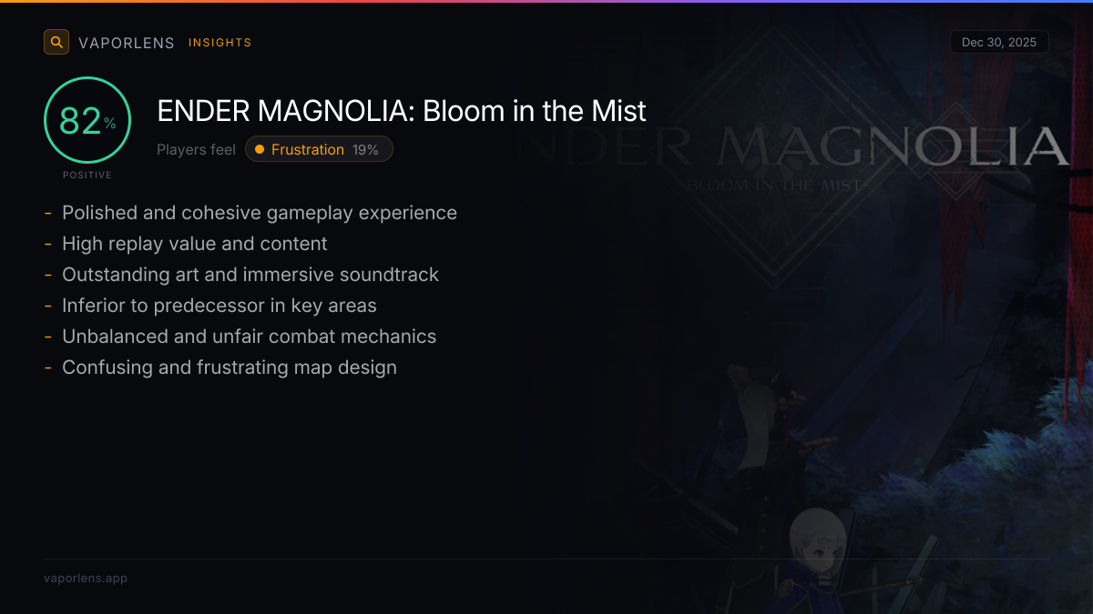 | Players consistently highlight the game's well-designed exploration mechanics, clear progression, and rewarding sense of discovery. The map design and exploration indicators (e.g., turning areas blue) enhance satisfaction and reduce tedium. | 85% |