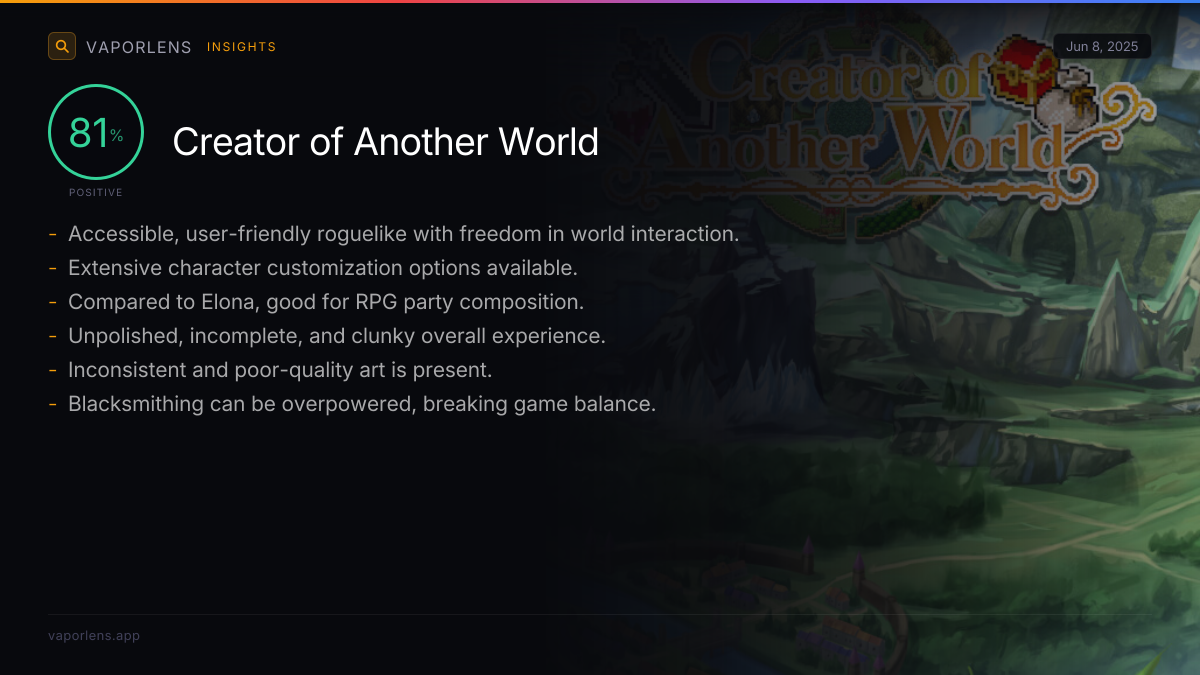 The game is designed to be accessible and enjoyable, especially compared to similar titles like Elona. It features user-friendly mechanics, comprehensive help features, and a relatively low difficulty, making it a good entry point for newcomers to the genre. Many reviewers found the game relaxing and easy to get into.