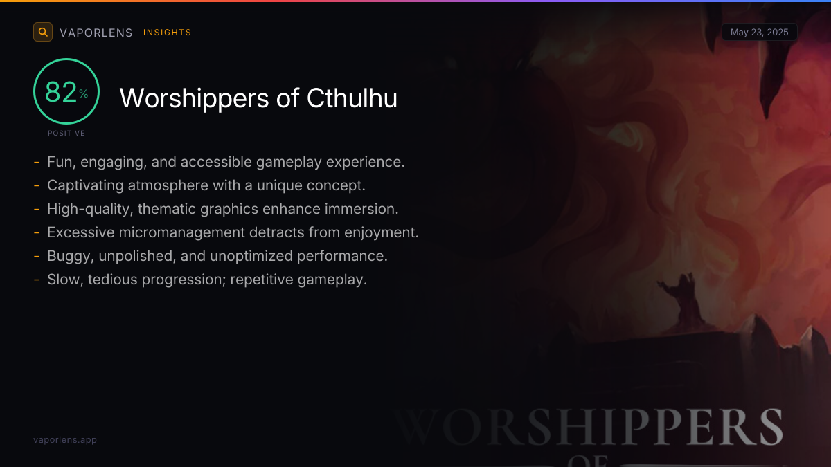 | The game has a captivating and immersive atmosphere, enhanced by spooky events, a haunting soundtrack, and well-written in-game text. The dark and eerie tone creates a sense of impending doom and wickedness, making it appealing to fans of cosmic horror. The voice acting also contributes positively to the immersive experience. | 28% |