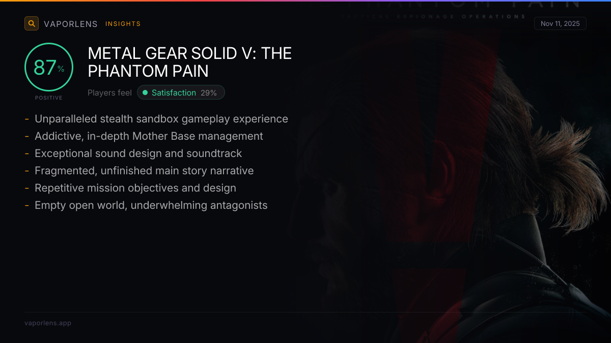 Players felt satisfied by the game's exceptional stealth action gameplay, open-ended missions, and innovative mechanics like the Fulton system. They also praised its engaging story, cinematic quality, excellent graphics, and high replayability, often considering it a masterpiece and a strong continuation of the series. The game's optimization, even on lower-end hardware, and the freedom to build a Private Military Company further contributed to this positive experience.