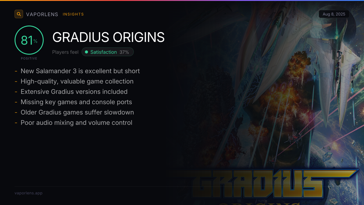 Players expressed satisfaction primarily due to the high quality of the collection, particularly M2's faithful arcade ports, comprehensive features, and excellent customization options. The inclusion and quality of the new game, Salamander 3, along with player-friendly systems and stable performance, significantly contributed to this positive sentiment, offering a strong sense of value and an enjoyable gameplay experience.