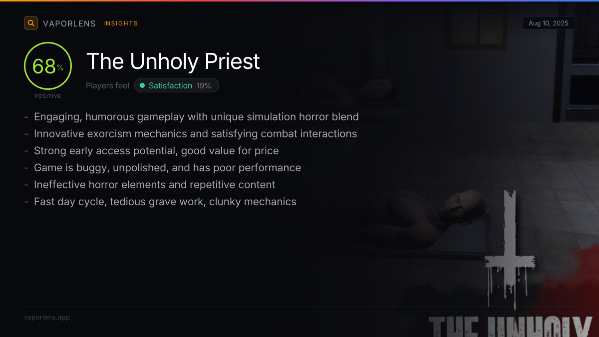 Players are satisfied with the game's unique blend of genres, particularly the horror and simulator elements, and its overall quality. The immersive exorcism mechanics, creative concept, and engaging gameplay loop contribute to a positive experience, often despite minor flaws.